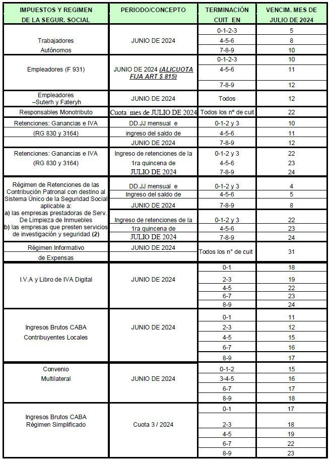 Les informamos algunos vencimientos impositivos de interés a producirse en el mes de julio de 2024, no abarcando la totalidad de los mismos. Otras novedadesVencimientos de noviembre24 octubre, 2025CIGSA 2025: Tiempo de descuento24 octubre, 2025Vencimientos de octubre26 septiembre, 2025FATERyH: Nuevo acuerdo paritario26 septiembre, 2025CIGSA 2025: En la cuenta regresiva26 septiembre, 2025Se modificó la Ley 6806: Alcance para consorcios y administradores28 agosto, 2025